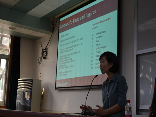 刘华胤老师首先向我们介绍了巴黎政治大学(以下简称“巴政”)的教学特点。巴政采取的是高度交叉的多学科教学,旨在培养全球化所需的复合知识型未来决策人才。巴政注重研究,目前已有12个领先的人文科学研究中心。全校40%的学生为国际学生,来自世界130多个不同国家和地区,同时巴政拥有超过350个遍布全球的合作伙伴大学:如哥伦比亚大学,哈佛大学,普林斯顿大学,伦敦政治经济乐天堂