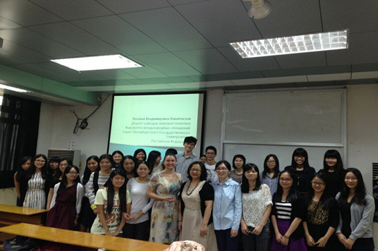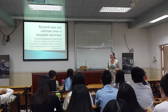 50多名俄语系大四学生做了一场以“语言与国家软实力”为主题的讲座。出席讲座的还有俄语中心主任杨可教授、俄语系郭利老师。