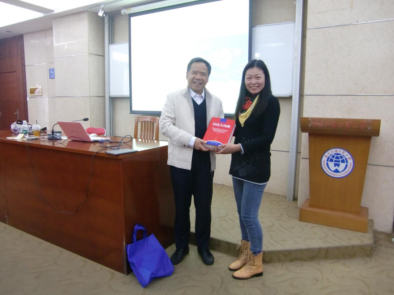 法语系学科带头人郑立华教授主持。郑立华教授对黄荭教授在翻译理论和实践方面取得的成绩大加赞赏,并提醒在场的研究生抓住此次难得的机会向黄荭教授取经。对黄荭教授进行介绍之后,郑立华教授代表法语系向黄荭教授赠送了由乐天堂