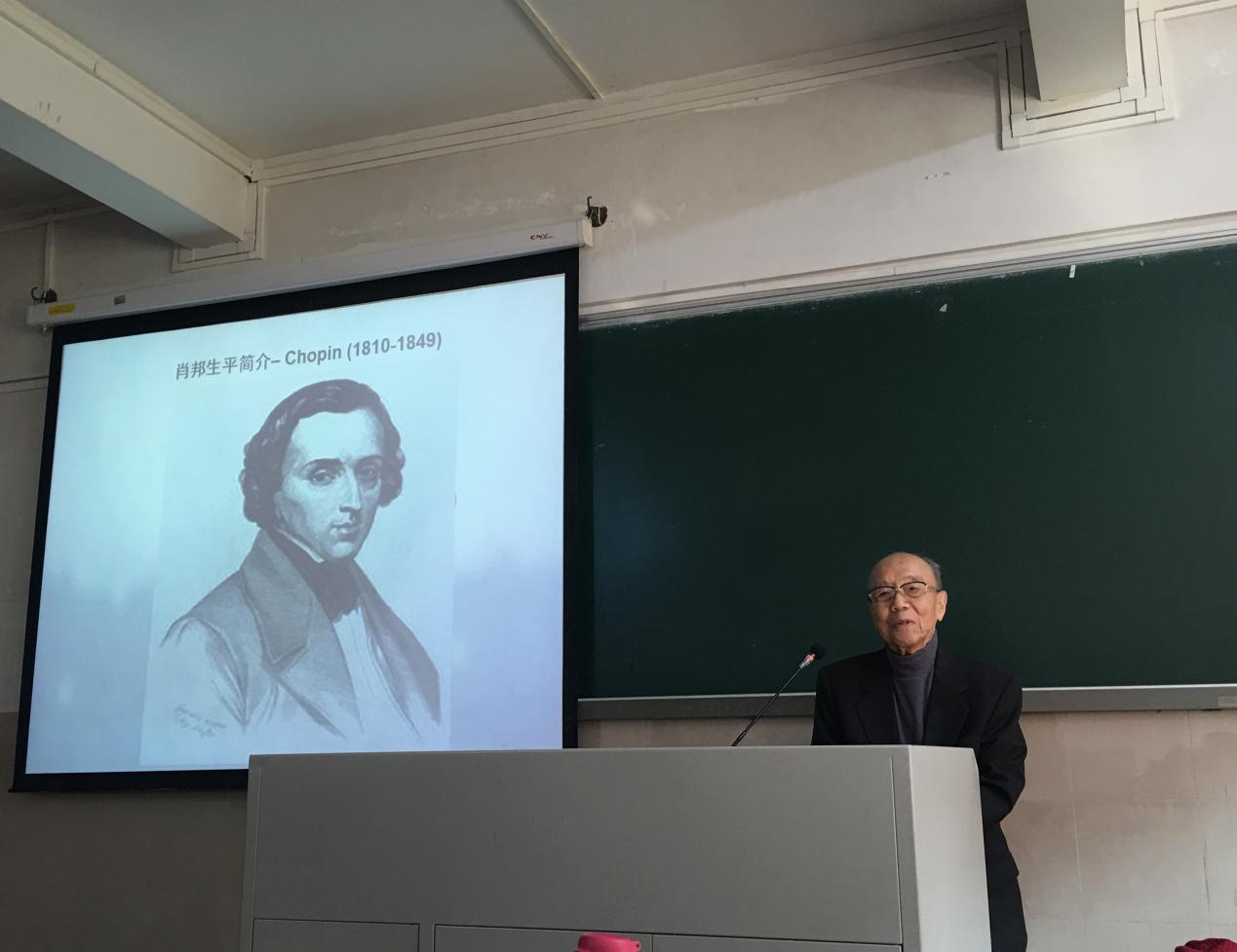 ,在二教131课室开展讲座,讲述有关肖邦和他的音乐的故事。波兰语系主任茅银辉老师、张和轩老师、波兰语系学生及音乐乐天堂