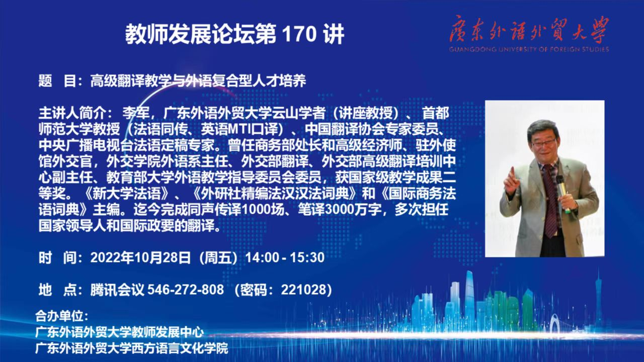 本网讯 2022年10月28日下午,教师发展论坛第170讲邀请了李军教授做题为“高级翻译教学与外语复合型人才培养”的专题讲座。此次讲座采取线上会议的形式,由法语系主任助理、法语MTI点负责人邓玮副教授主持,法、西、俄、德等多个语种口译专业硕士任课教师、各语种研究生及法语系本科生参加。