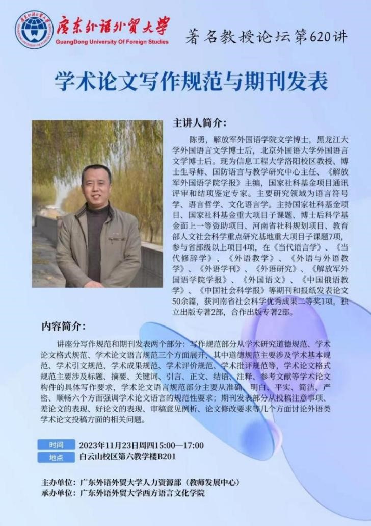 著名教授论坛第620讲在白云山校区第六教学楼B201教室举行。信息工程大学陈勇教授主讲《学术论文写作规范与期刊发表》。讲座由乐天堂