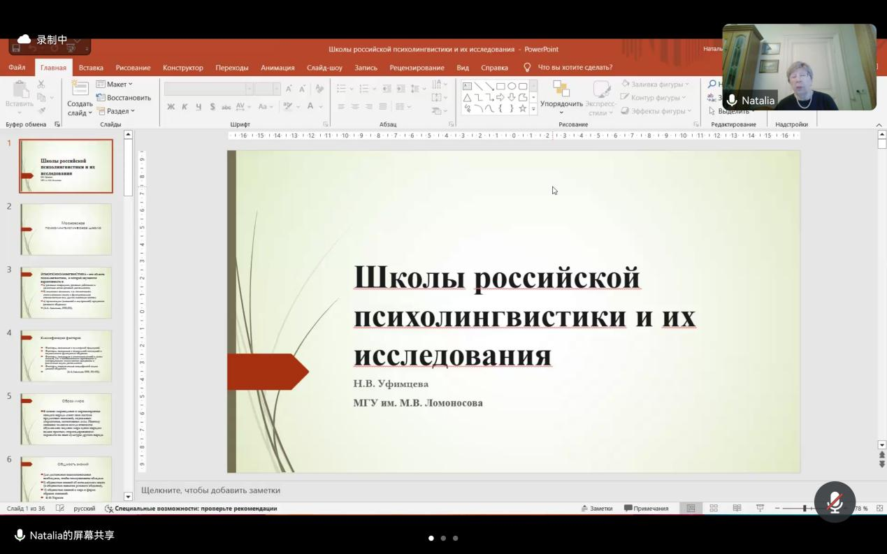 第二场讲座中,乌菲姆采娃教授首先讲述了研究历史最为悠久的莫斯科心理语言学派,并介绍了民族心理语言学的概念和相关的研究因素,指出语言对于产生民族世界观和意识共同性的必要性,以及“意识的内容总是由文化决定”,并以中国的汉语语言图景中的道德价值观为例加以解释。随后,乌菲姆采娃教授依次介绍了特维尔心理语言学派、彼尔姆心理语言学派和乌菲姆采娃心理语言学派,并展开描述了三个学派的研究内容。讲座最后,乌菲姆采娃教授深入讲解了圣彼得堡心理语言学派和沃罗涅日心理语言学派的相关研究,并列举了俄罗斯不同地区著名的心理语言学学者及其研究方向。本场讲座让大家对俄罗斯心理语言学各大学派有了进一步的了解。
