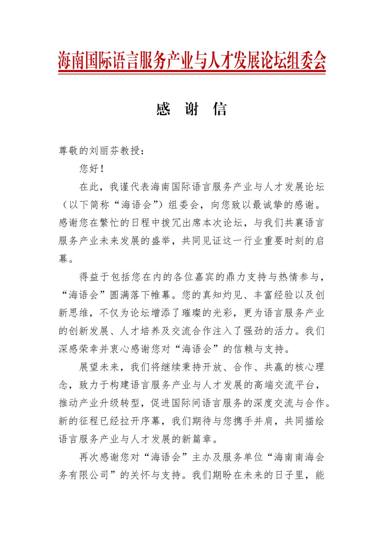 刘丽芬教授在会后收到来自海南国际语言服务产业与人才发展论坛组委会的感谢信。
