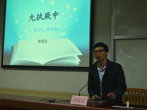 的曾超文老师以他深厚的中文底蕴给我们讲述了如何处理学习、工作与生活的关系。他提到,团学干部需要具有吃苦耐劳的精神,首先要树立正确的学习工作观念,把做好工作与搞好学习统一;第二要做好大学阶段的规划;第三是掌握科学工作与学习方法,合理安排时间;第四是要养成良好习惯,加强人品自我修养。其后他以中庸之道的“允执厥中”一词点出了整个演讲的精髓。
