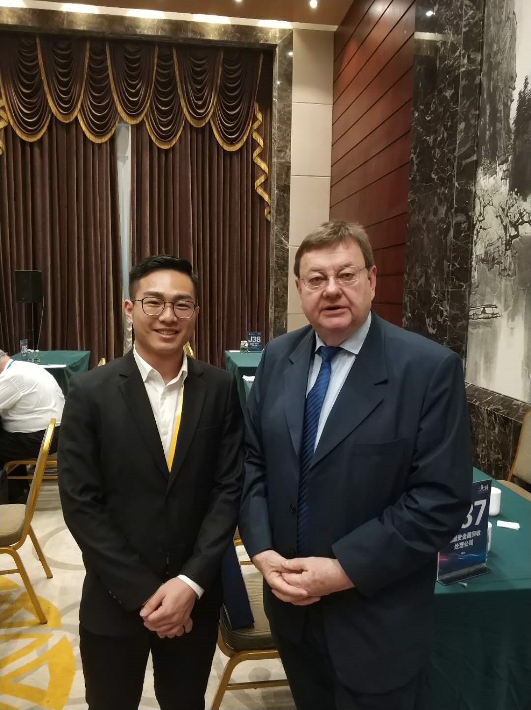 2018级学生张均在揭阳中德金属城,第四届中德中小企业合作交流会上为开姆尼兹商会主席MICHAEL STOPP的一对一对接会提供口译服务