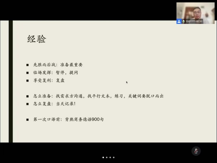 最后,张均学长对自己的实践经历进行了总结,认为译者要有先胜而后战的准备,还要有临场发挥的能力,复盘一定要在当天做下记录,针对第一次进行口译的同学,熟练商务德语900句是必要的。