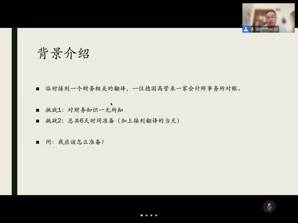 接着,张均学长以个人的实践经历为基础为同学们再现了一场口译过程。在背景介绍中,他提到临时接受的任务,即一位德国高管来一家会计事务所进行对账工作。并提到了这次口译任务对他而言的两大挑战,一个是他本身对财务知识的认知不足,对这个领域的相关词汇和用语熟悉程度不高;另一个挑战是时间的限制,加上接到翻译任务当天的时间,他的准备时间只有短短的六天。然后他谈到了译者准备阶段的重要性和必要的准备工作。