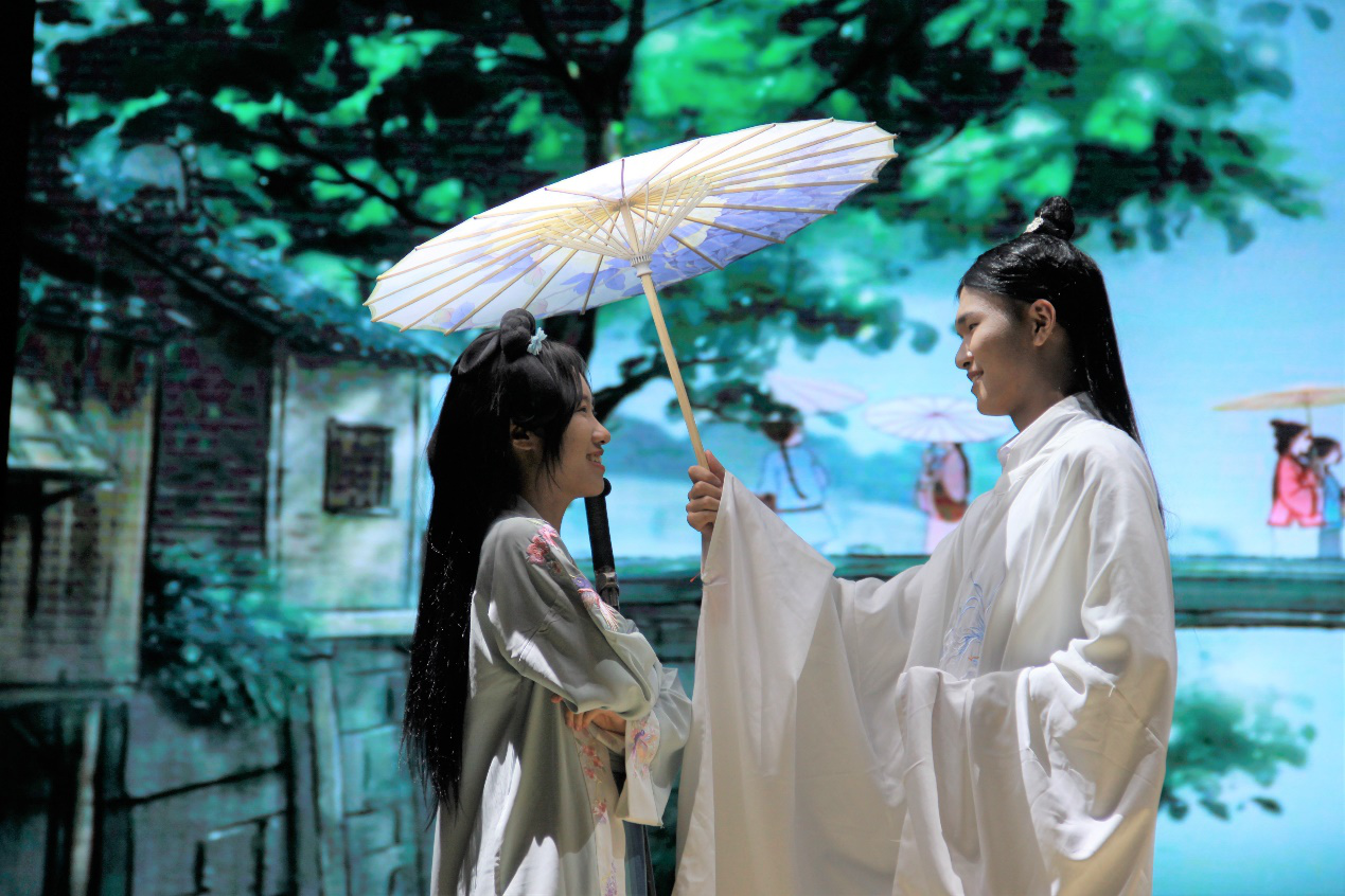 西班牙语剧组围绕“安详街”的故事也让人回味无穷,《安详街》作为本次戏剧大赛唯一一部中西作品,其故事、服装、道具都给观众留下了深刻影响。故事主要讲述了远离世俗纷争的深山中, 远离世俗纷争的深山中,伫立着着一座名为“安详街”的小镇。夏日某个午后,安详街迎来位不速之客。来者称莫⼩同,青涩面庞,黑剑佩玉。此番前来,他意寻偶像白三爷,与其切磋武学。然而,寻⼈计划在初⼊安详街时就陷困境,⼼灰意冷的莫⼩同本想就此离去,却接二连三遇到怪事,由此卷入一场尘封十几年的江湖纷争。