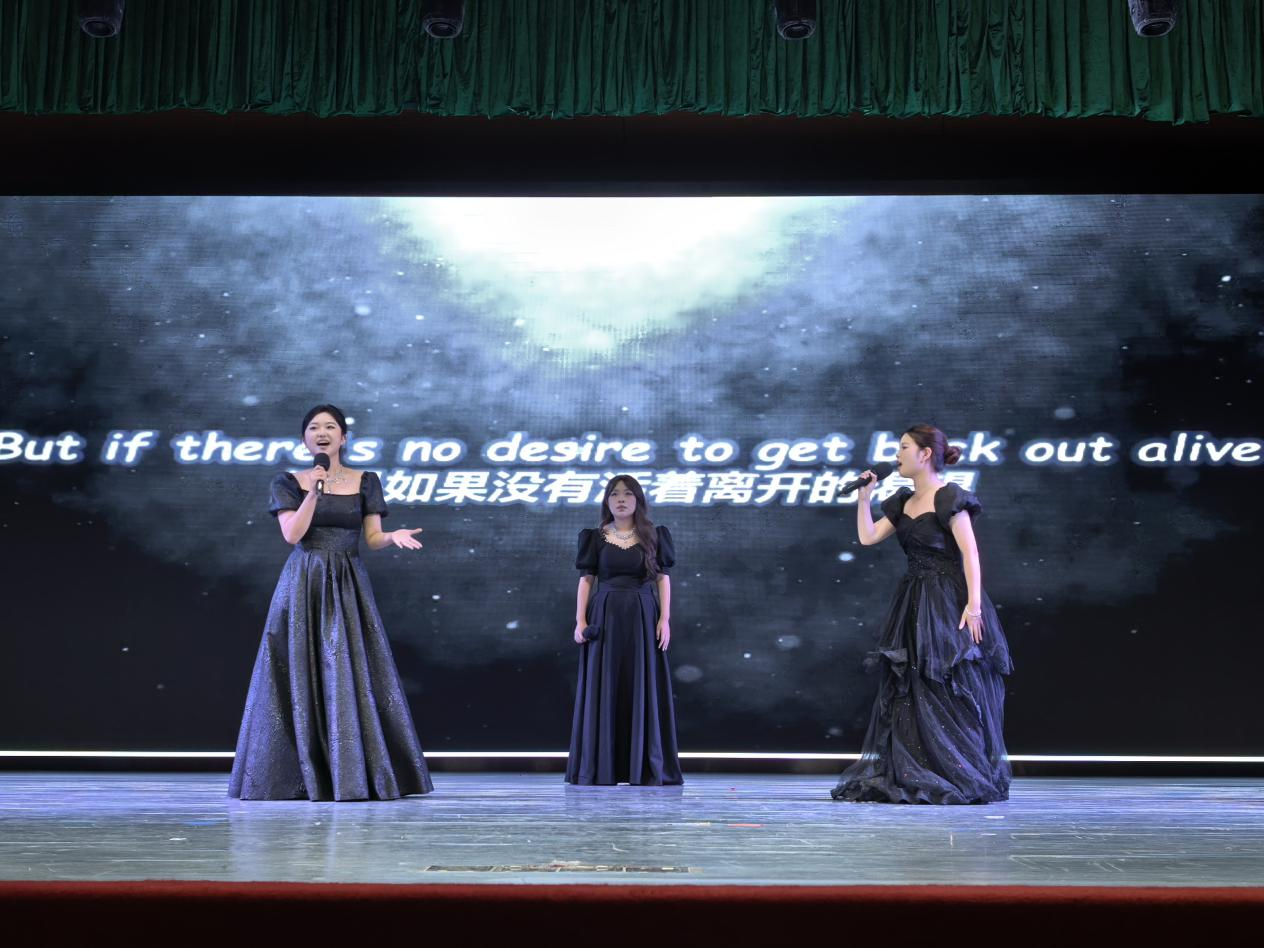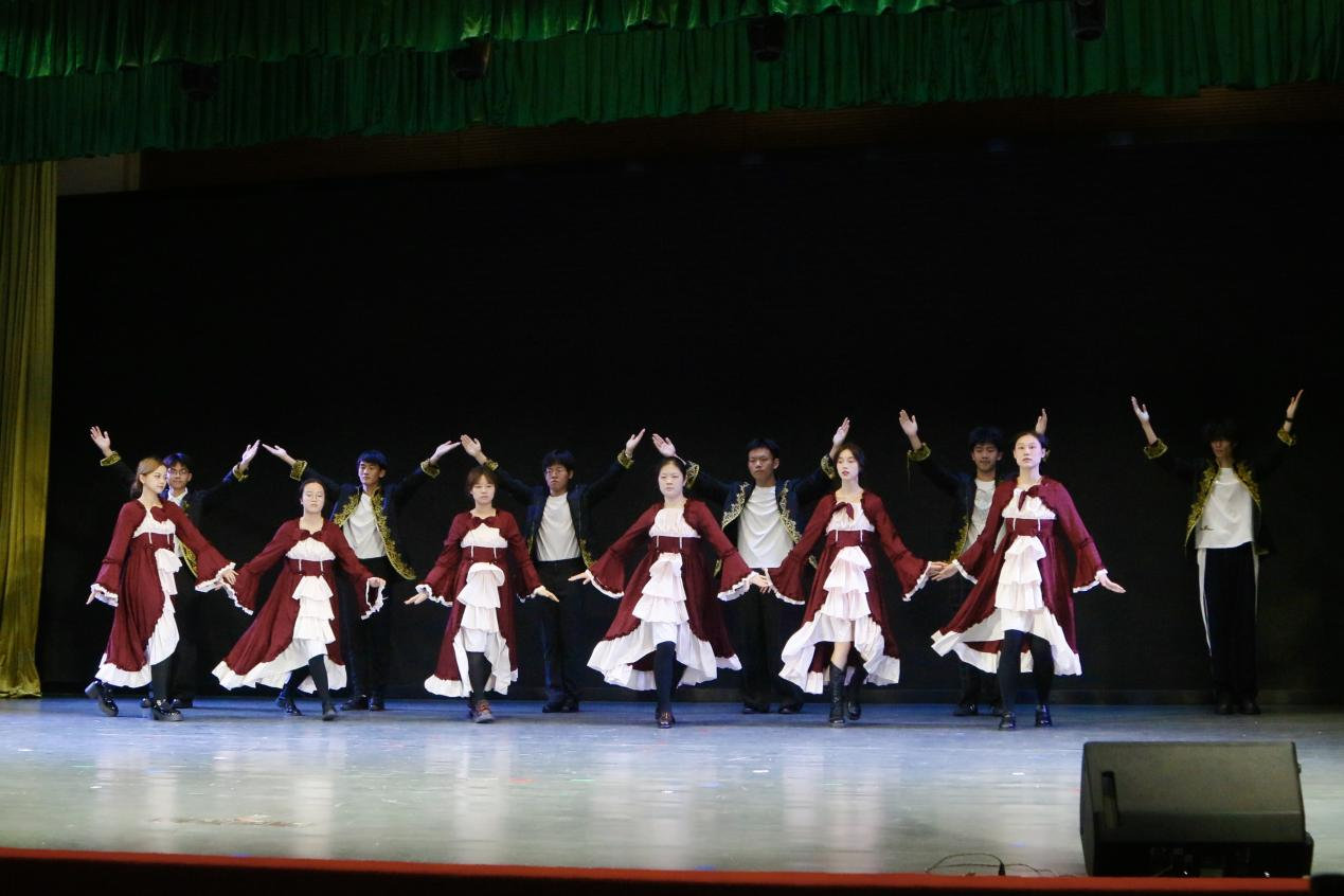 第三篇章“启新程”在霏阳吉他社极具动感的《Beneath the Mark》和《Fear for Nobody》中开始,富有动感的音乐再一次点燃了现场观众的热情。德语国贸2501班的同学们一曲《紫荆花盛开》,通过紫荆花的盛放,展现了团结与共生之美。校话剧队的《宝玉重返大观园》让人目不暇接,台上的演员们表情生动,动作流畅,带来了一场视觉盛宴。西语国贸2501班同学们《一笑倾城》,在他们年轻的面庞上洋溢着富有感染力的笑容,清脆的歌声中承载着勇气与真诚。