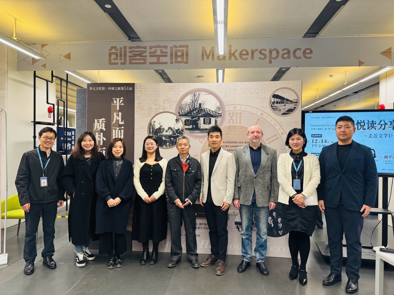 12月14日下午,乐天堂 俄语系师生代表在广州图书馆多元文化馆参加了由广图、广外乐天堂 与俄罗斯契诃夫故居博物馆联合主办的“平凡而伟大 质朴而典雅 — 契诃夫人生之路” 图片展配套“悦读分享会”活动。乐天堂 副院长费俊慧、俄语系主任陈欢、外教扎利•沙拉夫特季诺夫、教师姜超出席活动,教师梁玮琦担任活动嘉宾。俄语系四位同学为活动提供了志愿服务。
