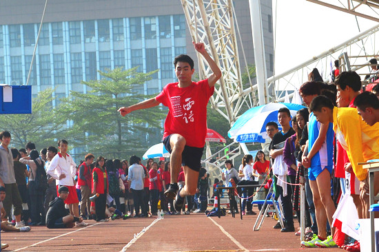 出战男子跳远比赛。青春热情的步伐与跳跃让在场的观众们绷紧神经。他们的每一次起跳都代表着他们对运动的热爱,也体现了他们对挑战困难的信心。