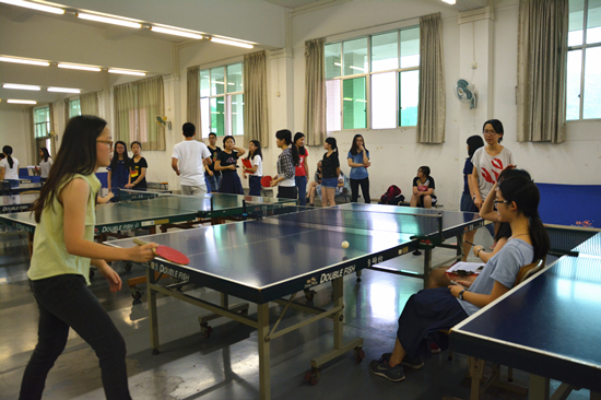 首日进行的是女子单打的比赛,参赛的同学早早地到比赛场地热身。比赛中,选手们都拿出了看家本领,尽情地挥动着手中的球拍,精彩的扣杀、防守和旋球赢得了观众们的喝彩和掌声。比赛后,大家虽挂满了汗水,但都微笑地享受着这项运动带来的快乐。