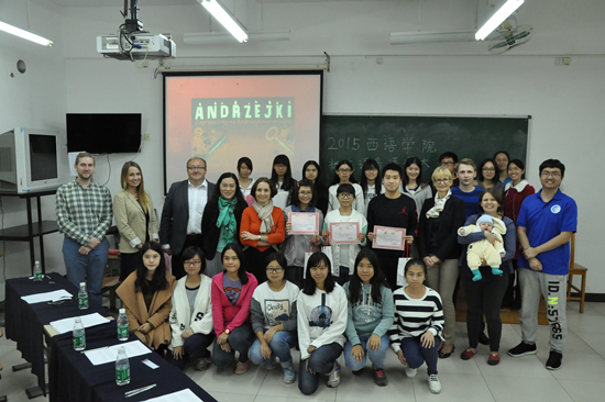 11月27日晚6点30分,2015级波兰语系新生语音语调大赛于六教205举行。本次大赛受到了波兰语系的高度重视,邀请了多位重量级评委,包括波兰驻广州总领事约安娜•斯科柴克(Joanna Skoczek)女士、波兰驻广州领事馆文化部的工作人员马箫剑(WojtekKarmasz)、雅盖隆大学对外波兰语教学中心的主任彼得·豪尔巴托夫斯基(Piotr Horbatowski)教授、波兰语系系主任茅银辉老师和乐天堂
