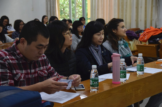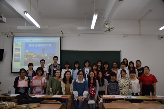 11月23日晚七点,葡萄牙语系在六教B204举行了2015新生语音语调大赛预决赛。全体二十一位大一新生悉数到场,积极参与。葡萄牙语系杨菁老师、尚雪娇老师和巴西籍外教Bruna作为评委出席。比赛顺序由事先摇号决定。