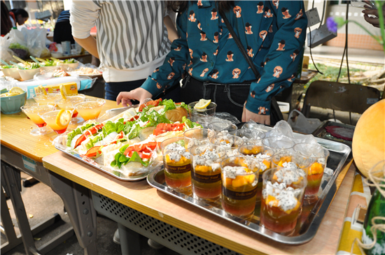 师生和外国友人的驻足品尝。此外,还有外国友人助阵摊位,即兴弹奏音乐,各摊位成员倾情走动宣传美食,现场洋溢着欢乐和谐的气氛。