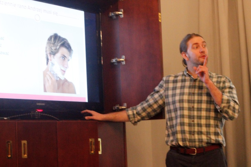 接着,紧张的知识竞赛在总领事助理马箫剑(Wojtek Karmasz)先生的主持下开始了。此次竞赛涵盖了波兰语词汇、语法以及波兰政治、历史、文化、地理等方面的知识点。同学们在竞赛中表现良好,而最终赢得冠军的队伍,获得了由斯科柴克女士颁发的奖品。