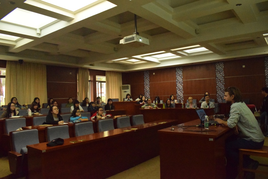 彼得•卡林斯基向大家展示了他的家乡——欧洲著名城市克拉科夫的风采,包括其自然景色和人文风光。他还介绍了扬·马特伊科(Jan Matejko)和约瑟夫·查普斯基(JózefCzapski)等众多对他产生了重要影响的波兰画家。此外,卡林斯基通过展示图片视频和讲述自己在法国、中国的经历,向大家详细地介绍了他成立的书店、自己的工作过程和一系列作品,引起了大家对插画图绘的兴趣。同学们纷纷向他提问关于其作品和绘图的问题,现场气氛十分活跃。