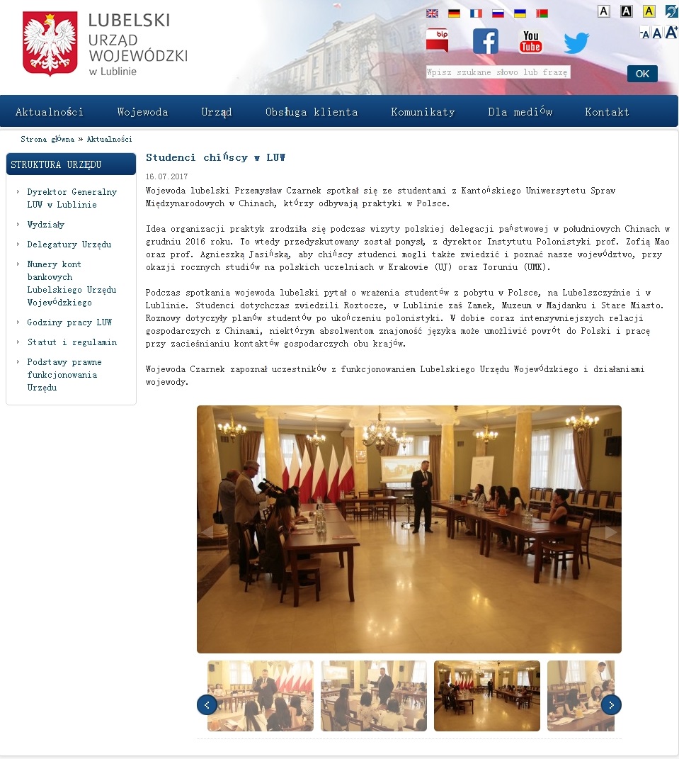 当日,卢布林省政府官网对此次见面进行了报道。报道强调了广外波兰语学子此次实习是得益于2016年12月波兰国家代表团在中国南方访问期间,与广外波兰语系系主任茅银辉教授、外教阿格涅什卡·雅辛斯卡(Agnieszka Jasińska)教授的友好交流,并指出在当前中波经济贸易往来日益密切的大背景下,广外波兰语人才对未来密切深化中波经济联系的巨大潜能。