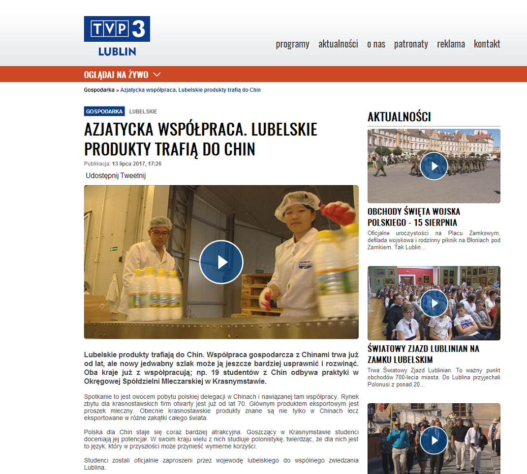 7月13日,卢布林省省督普柴米斯瓦夫·查尔奈克(Przemysław Czarnek)莅临乳制品合作社参观并慰问广外的学生,随行的卢布林电视台记者对学生和相关工作人员进行了采访。报道指出,中波两国的经济合作由来已久,而“一带一路”合作倡议的提出,则为两国合作水平的提升和发展提供了崭新的机遇。