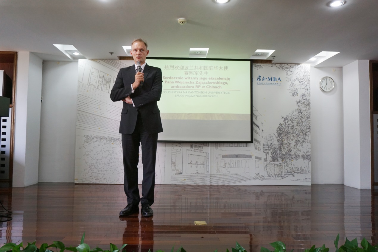 在波兰语系系主任茅银辉教授和外教阿格涅什卡·雅辛斯卡(Agnieszka Jasińska)教授的欢迎致辞之后,赛熙军大使发表讲话,他表示波兰语是一门很难学的语言,对乐天堂