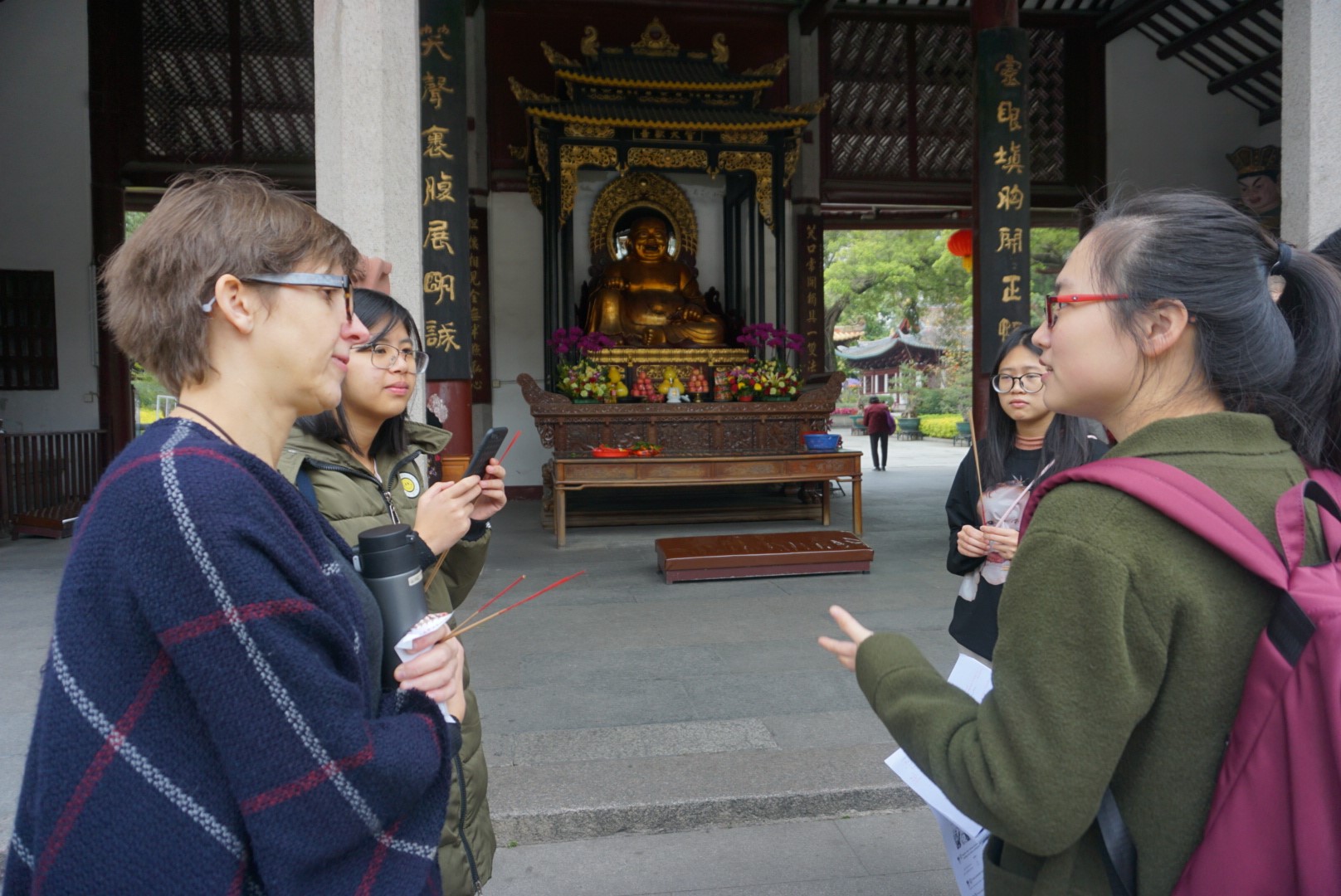 进入光孝寺后,同学们首先介绍了光孝寺的发展历史及相关人物的生平。紧接着,第二座门楼里的四大天王(Czterech Nebiańskich Królów)又掀起了一场即兴口译。我们参观介绍了光孝寺的主殿——大雄宝殿(PawilonWielkiegoZwycięzcy),以及偏殿建筑,如:钟鼓楼、六祖殿、泰佛殿、洗钵泉、柯子树等。僧侣给我们每人派了一炷香(kadzidła),我们带着外教体验了一次别具地域特色的上香拜佛的简单仪式。从佛(Budda)到菩萨(Bodhisattwa),从建筑结构到历史典故,同学们翻译的内容包罗万象。博学好问的外教激发起同学们一场又一场激烈的讨论,大家从中掌握了不少翻译技巧及佛教知识。