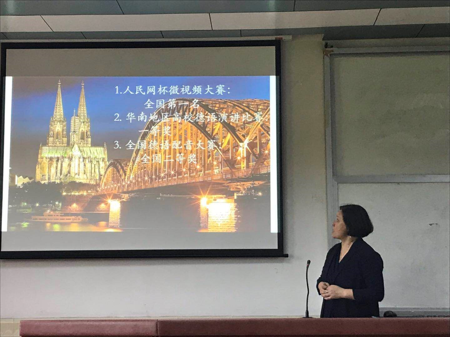 本次交流会由滕奕丹老师主持,经验分享者分别是人民网杯微视频大赛、华南地区高校德语演讲比赛以及全国德语配音大赛的获奖学生代表。交流会正式开始之前,滕奕丹老师首先向同学们介绍了本学年乐天堂