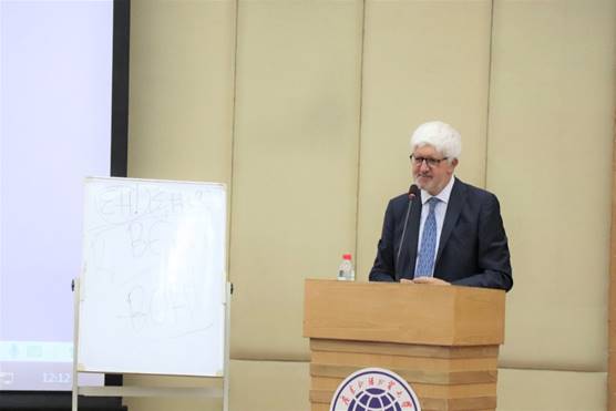 塞沃尼尼先生认为,语言并不是单词地简单堆砌,而语言学习也并不是简单的单词、语法学习。真正学好一门语言,必须了解创造和使用这个语言的民族,要了解这个语言承载的文化。意大利人沟通能力强,能闻弦歌而知雅意。塞沃尼尼先生用幽默风趣的语言为同学们介绍了由19个字母组成的8个感叹词。他在完美地诠释意大利人的沟通天赋的同时,鼓励同学们要深入学习、了解和思考语言中的文化。