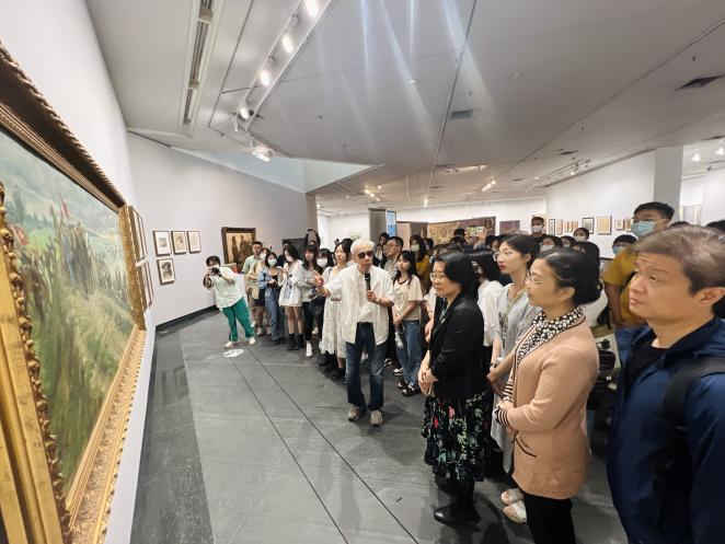 师生党员们在观赏中驻足,在画作前沉思。参加本次活动的邹同学表示,很高兴有机会参观展览,在二三楼看到了好多不同时期的作品,其中有法国画风、苏联画风,恽老现场的讲解和丰富的画作,让人感觉到了恽老本人对身边生活细节的强大感受力,个人喜欢画作《维吾尔族少女》、《工人的肖像》、《夜深》等,希望以后还有机会能多看看。另一位冯同学表示,月初就在展览app上注意到恽老的画展,当时看见了洪湖相关的几张作品,感觉色彩非常漂亮;到现场以后特别喜欢《荫》,感觉色彩和光影很温暖,凑近看了很久,还有《洪湖红》的亮红色湖面视觉冲击力特别震撼,恽老的讲解令其感悟颇多,了解了非常多的历史知识。