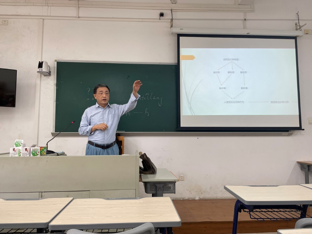 随后,借助对功能主义派别所强调的语言的交际功能的讲解,即研究人类如何通过语符构建世界和沟通,引出下一个话题“何为语符”。在第二部分中,刘齐生教授介绍了当代语言学的基础科学——符号学及其本质。首先,他对错误的命名说理论进行否定,进而引出索绪尔提出的语言符号的概念及其任意性、约定俗成性和关联性。他讲到,事物的名称并非只是一个代号,当一个人说出这个事物的名称,其背后一定隐含着这个人对于这个事物的想象(意识);我们只会认可我们这个语言中联结的意义,而排挤其他的可能性。当我们将其转换成另外的语言,所转换的是我们大脑中的概念,而非目标语的概念;语言符号联结的不是事物和名称,而是概念和音响形象。其次,刘齐生教授对皮尔斯(Peirce)的符号学进行了简要介绍,皮尔斯的符号学对符号进行了分类:指示符、像似符和象征符。符号作为人类语言的本质,是一种契约,或者说公约。在这里,刘齐生教授就提出了“两种语言之间是否可以通约?”的问题,并以“翻译”为例,说明了两种语言通约的条件,即译者要将A语言中的观念,在B语言中完全表达出来,这也是,翻译行为应追求的最终目标,而非简单地将A语言“转化”为B语言。