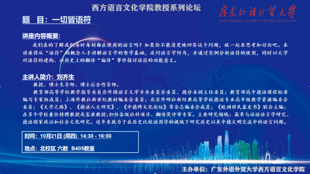 德语系刘齐生教授主讲《一切皆“语符”》。讲座由研究生办公室主任臧宇老师主持,辅导员张阳老师协助,乐天堂