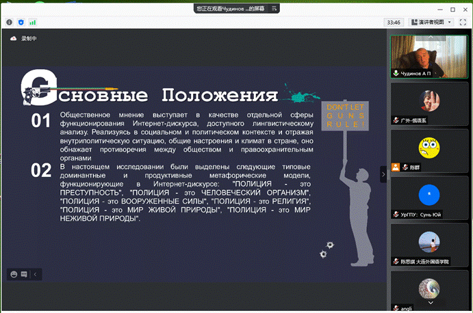 虽然受疫情影响,丘季诺夫和鲁仁采娃教授无法亲临广外现场授课,但线上的精彩讲座给俄语系师生留下了深刻影响,学生在线上积极与专家互动和提问。该系列讲座水平高,专业性强,让大家对俄罗斯政治语言学的理论、研究方法以及发展前景有了更为全面深刻的了解,了解了该学术研究领域的最新动态,激发了师生们的学术兴趣和科研热情。