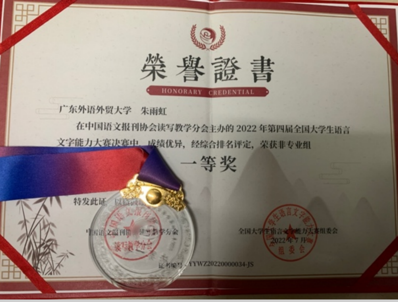 此外,朱雨虹同学还在今年5月获得了各葡语国家驻华使馆举办的葡语征文大赛亚军,在2021年获得了澳门中葡经贸论坛、澳门理工大学举办的葡萄牙语国家宣传片创作比赛一等奖以及中国孔子基金会举办的儒家经典跨语言诵读大会的小组一等奖。