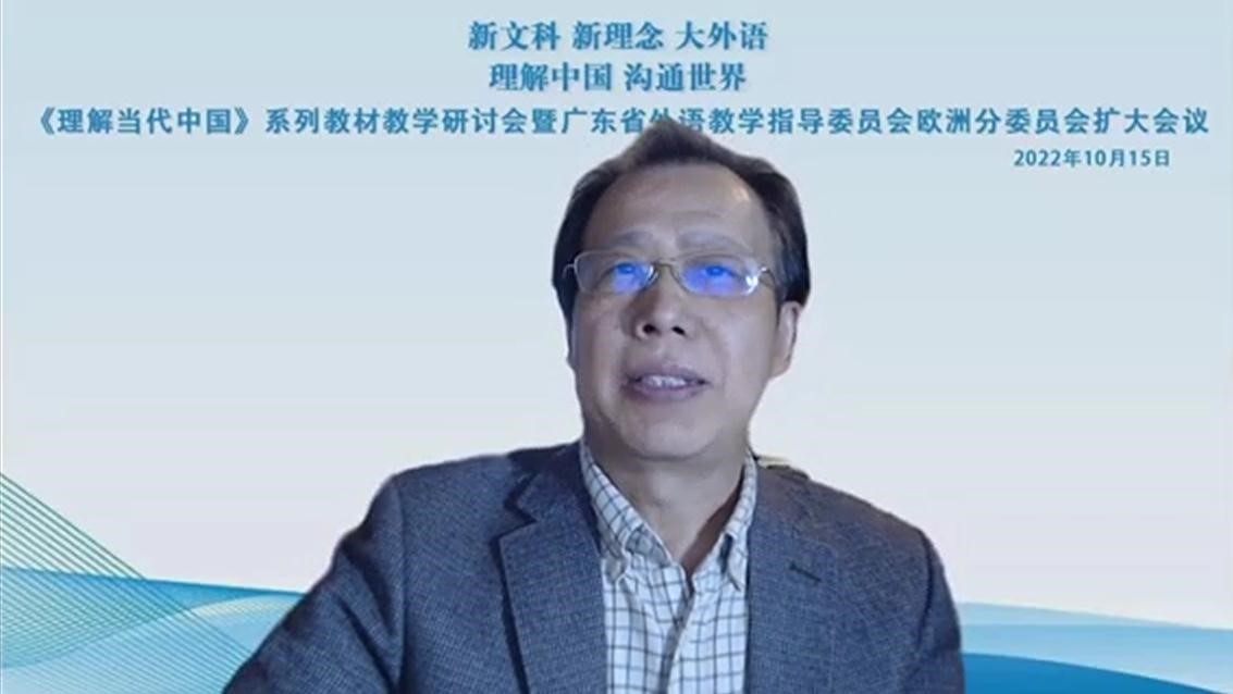 外国语言文学类专业教学指导委员会主任委员、北京外国语大学党委常委、副校长、《理解当代中国》系列教材总主编孙有中教授在致辞中表示,此次研讨会广东省高校欧洲语言专业的专家们共同探讨如何落实好《理解当代中国》多语种系列教材进课堂和新文科背景下外语人才培养的相关问题,对于进一步推进新文科建设、深化新时代外语教育改革,培养新时代外语人才具有重要的意义。广外作为广东省本科高校外语类专业教学指导委员会主任委员单位,扎实推进《理解当代中国》系列教材进高校,促进“三进”工作在全省高校所有10个欧洲语言专业的全面落实,也为其他省市进一步推进“三进”工作的开展积累了经验。