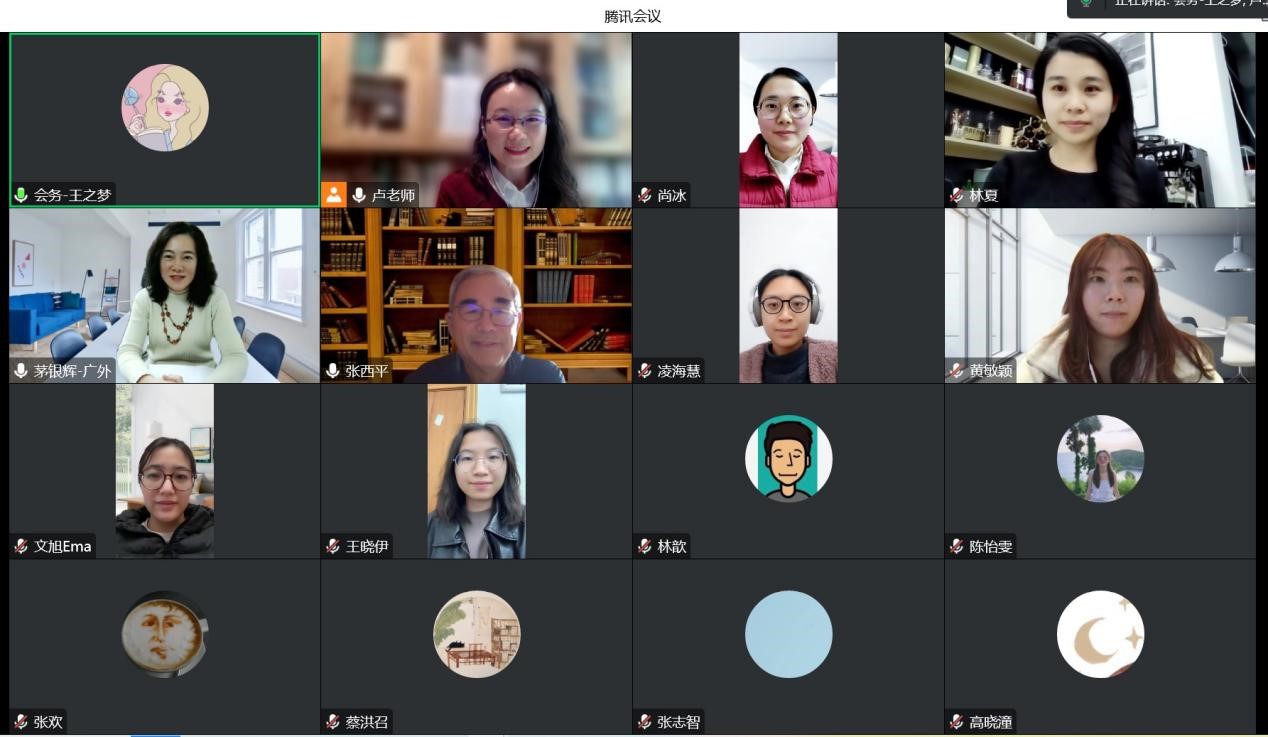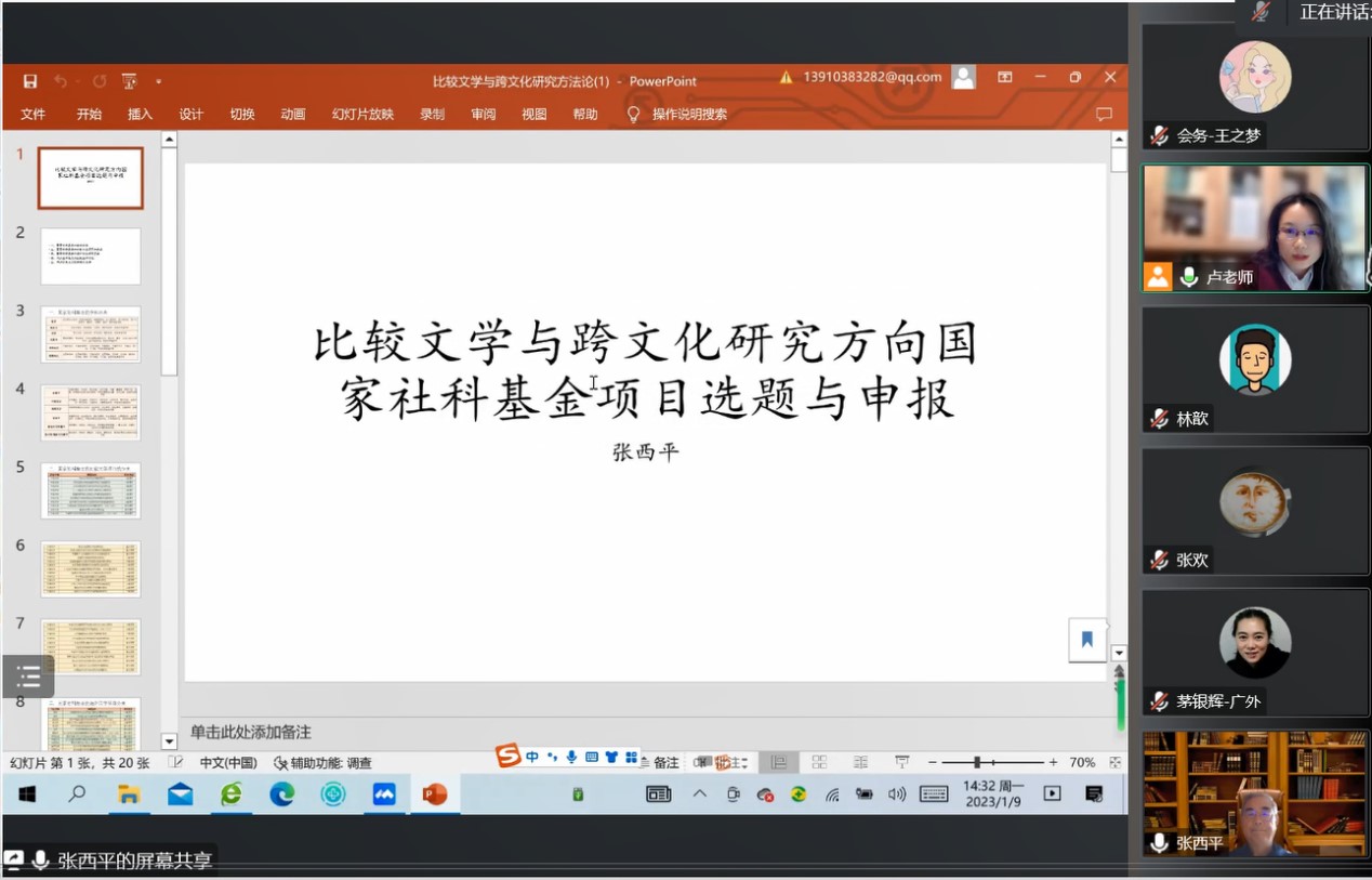 举办2023年度高层次项目申报第三次指导会,北京外国语大学张西平教授应邀针对国家社科基金项目申报作了题为“比较文学与跨文化研究方向国家社科项目的选题与申报”的指导。20位教师通过腾讯会议参与此次指导会,会议由卢铭君副院长主持。