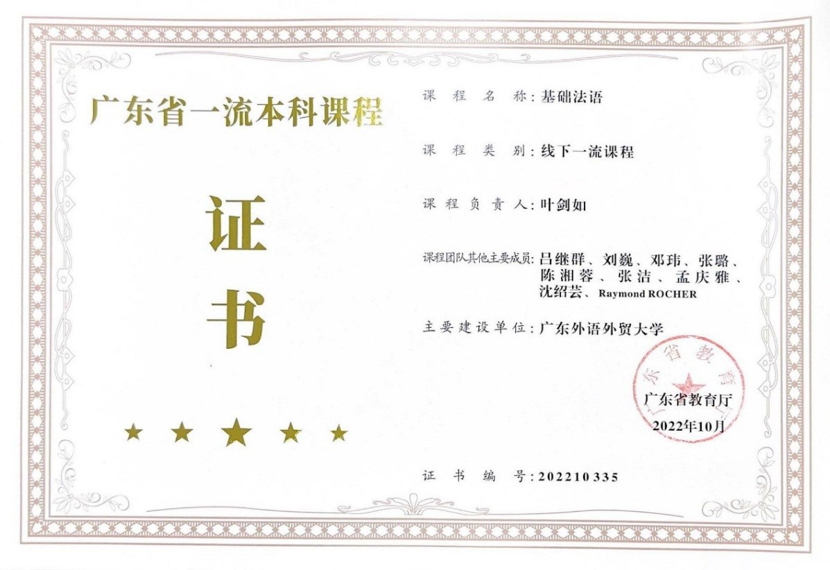 3门课程喜获广东省一流本科课程。其中,《基础法语》、《中世纪及近代德语文学史》入选广东省线下一流本科课程,《基础西班牙语》入选广东省线上一流本科课程。