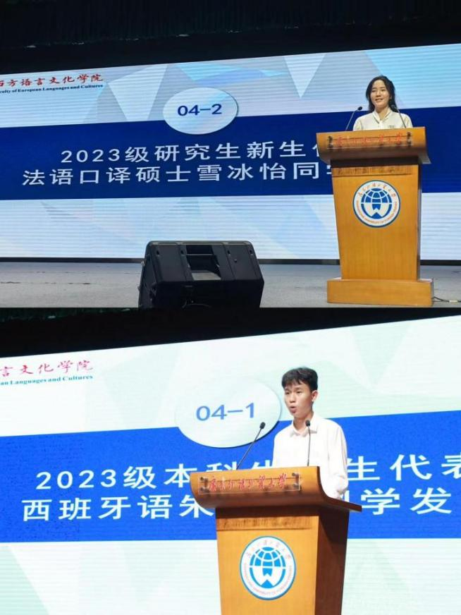 本科生新生代表、来自西班牙语专业的朱开屹,研究生新生代表、来自法语口译的雪冰怡两位同学分别代表新生表达了成为新一代广外人的骄傲和自豪,并表示加入广外乐天堂