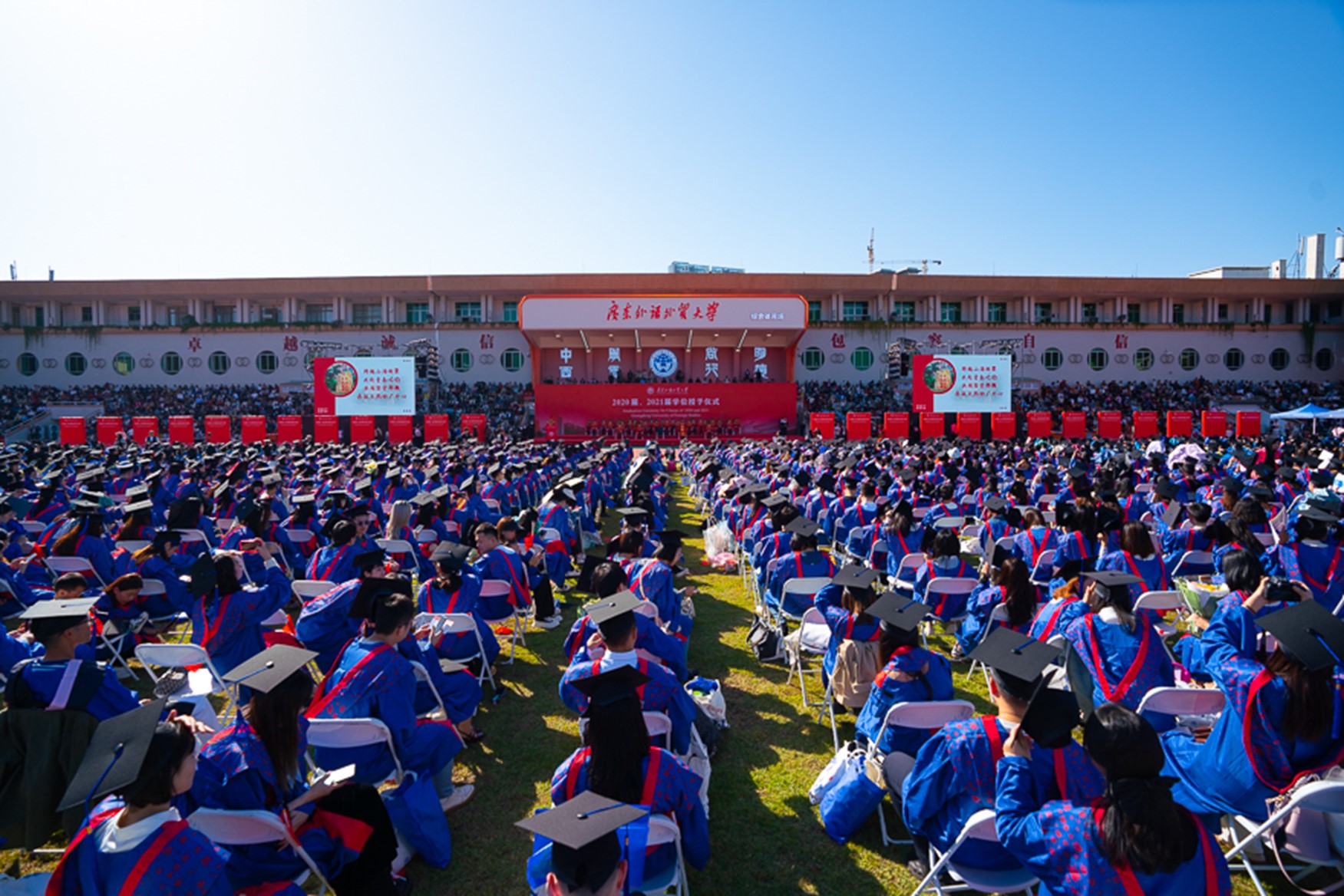 2020、2021届的校友陆续入场。校友们谈笑风生,笑容如阳光明媚,心情也如天气舒爽;学位服与操场舞台相衬出抹抹亮色,轻轻拨动学位帽上的帽穗,为他们炽热的校园生活画上了圆满的句号,但青春的美好与激荡仍在,他们亦将迎来属于自己的愈加美好的篇章。