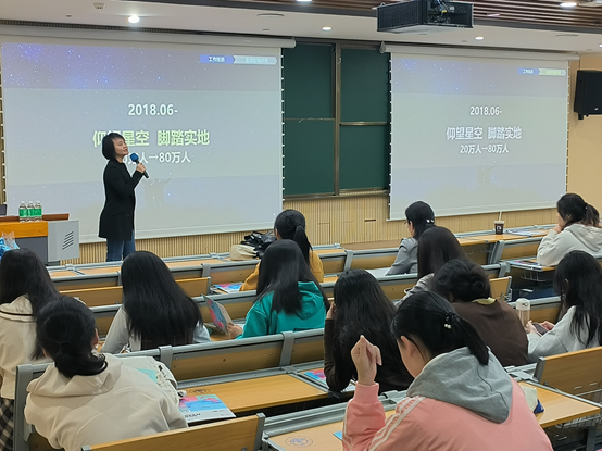 创新创业导师,比亚迪集团人力资源处总经理王珍女士和同学们分享她在比亚迪一路走来的职场成长故事。分享会由乐天堂
