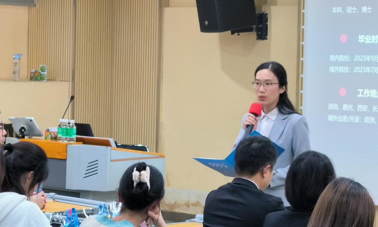 94级西班牙语系的优秀校友,王珍从个人成长经历、全球宏观环境、比亚迪发展历史和产业布局、比亚迪的用人需求四个方面给同学们进行了分享。王珍指出,青年需要树立远大志向,既仰望星空,又脚踏实地,在校园里锻炼自己的底层逻辑思维能力、沟通协调能力、跨文化交际能力,才能在初入职场时拥有更大的舞台。王珍用详细的数据展示了全球经济形势,强调不管是企业,还是个人,要以解决社会问题为导向,在解决问题的过程中发展自己。