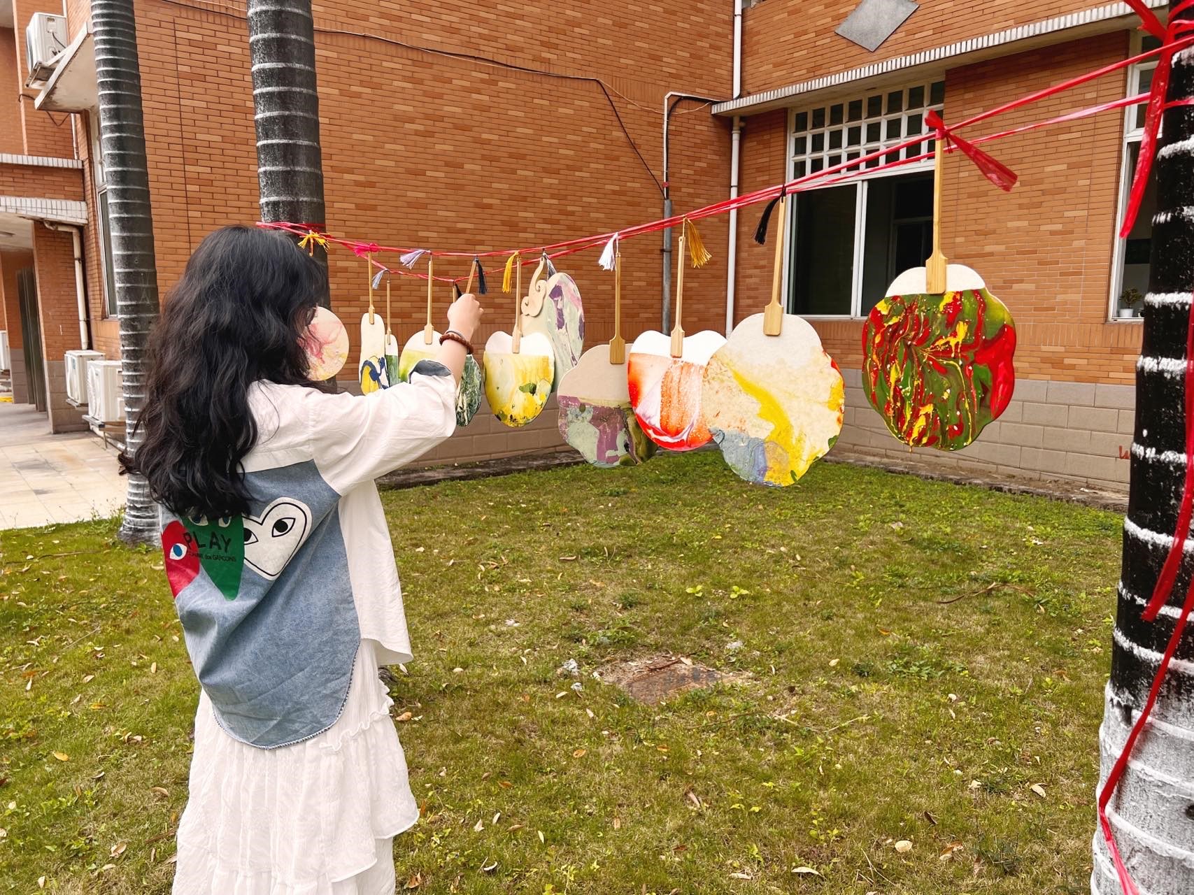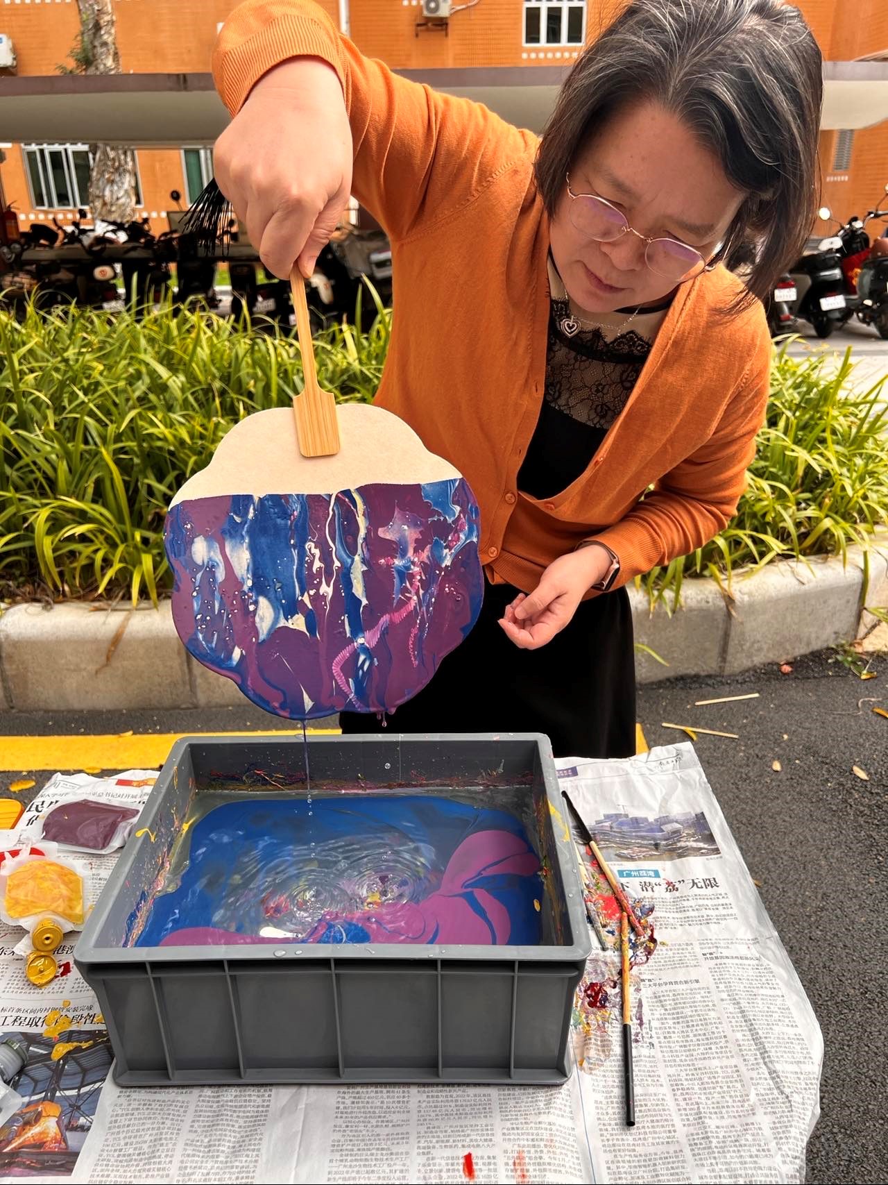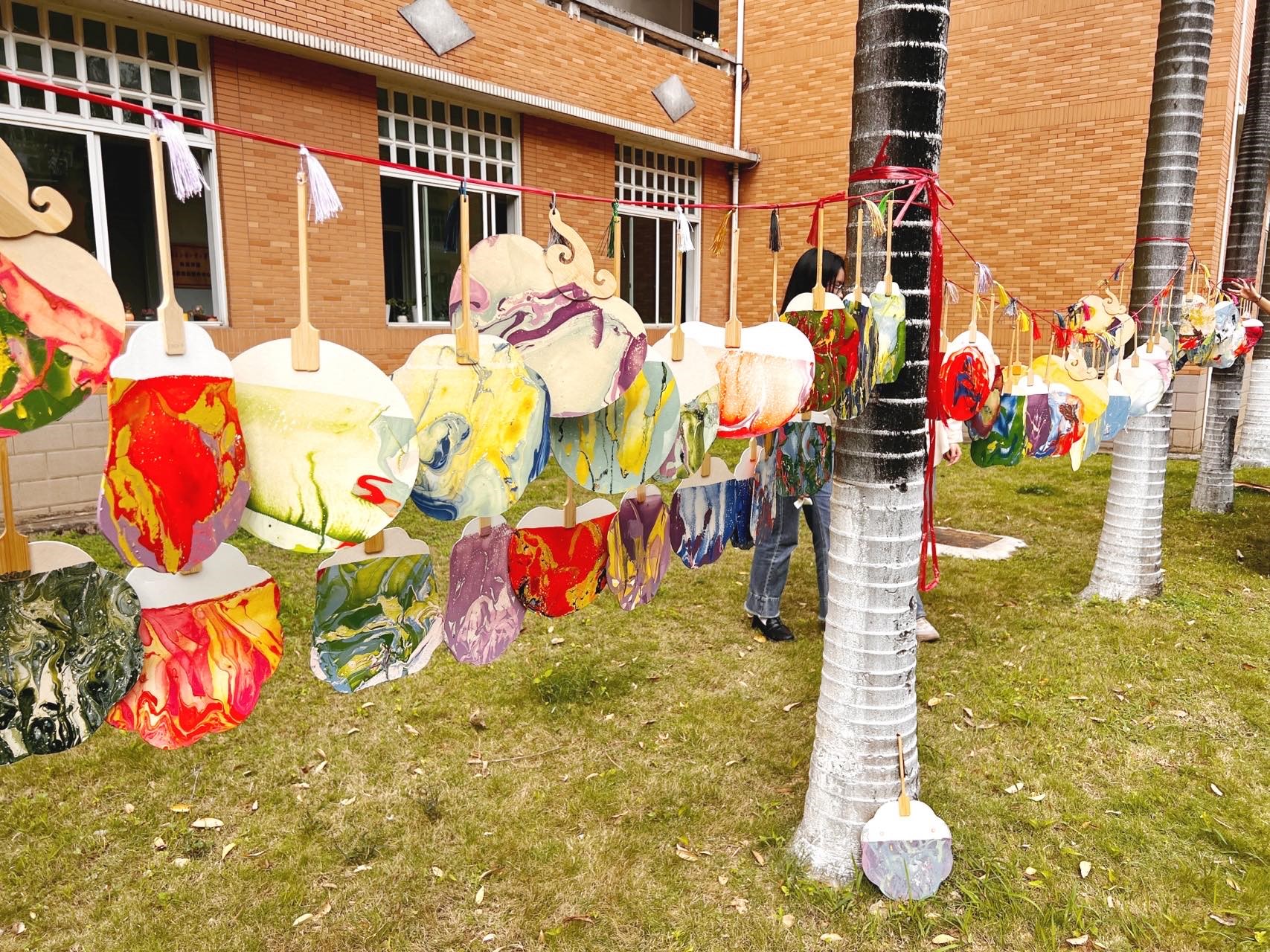 在四教门口举办“以漆绘扇·用爱传承”心理美育活动,旨在通过用团扇漂漆的活动,带领同学们感受中国传统非遗文化的魅力,并在心理美育活动中愉悦身心,放松心情。