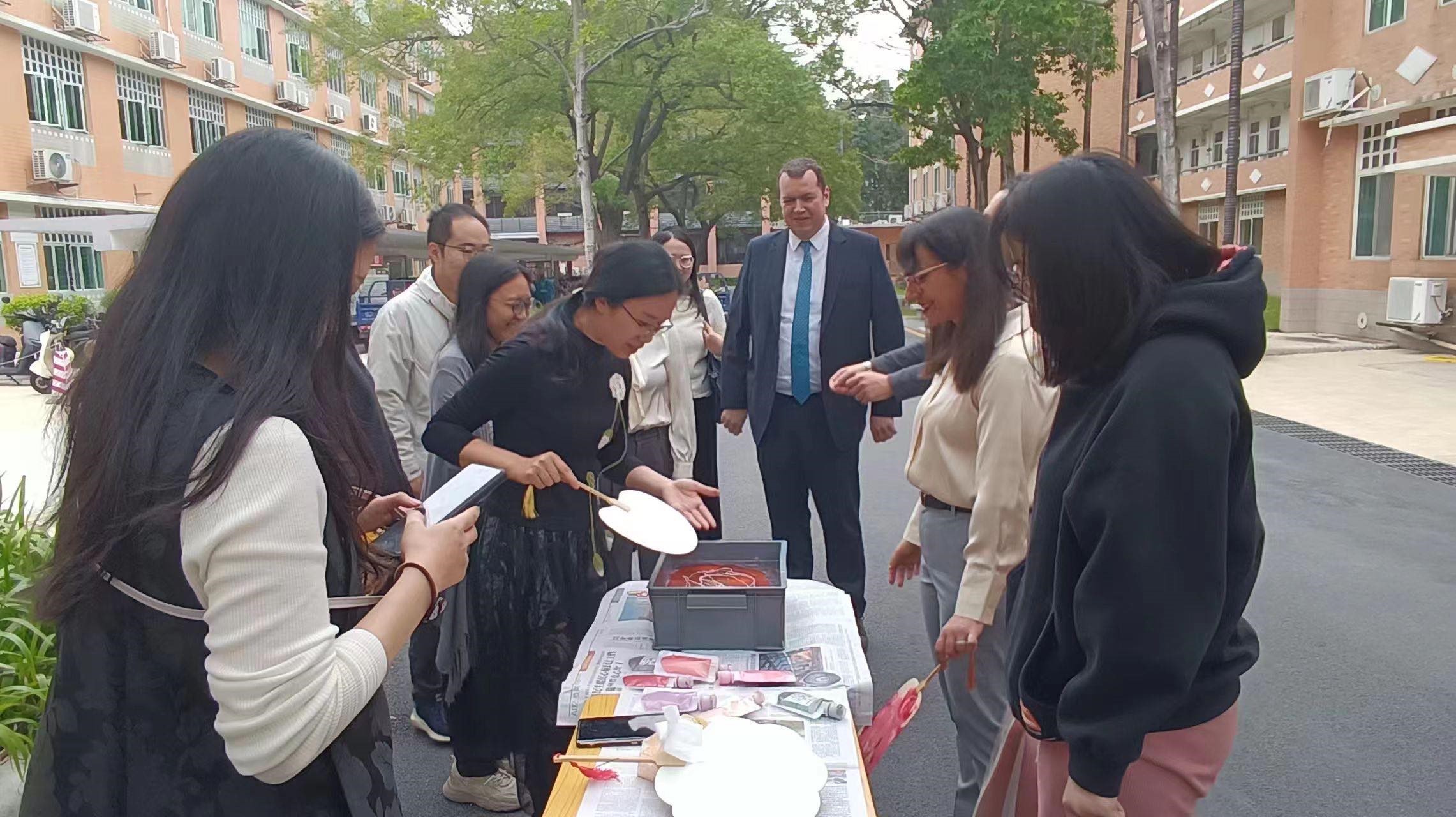 参加外事活动的希腊驻广州总领事馆的总领事等人也一起观赏漂漆制作团扇的全过程。