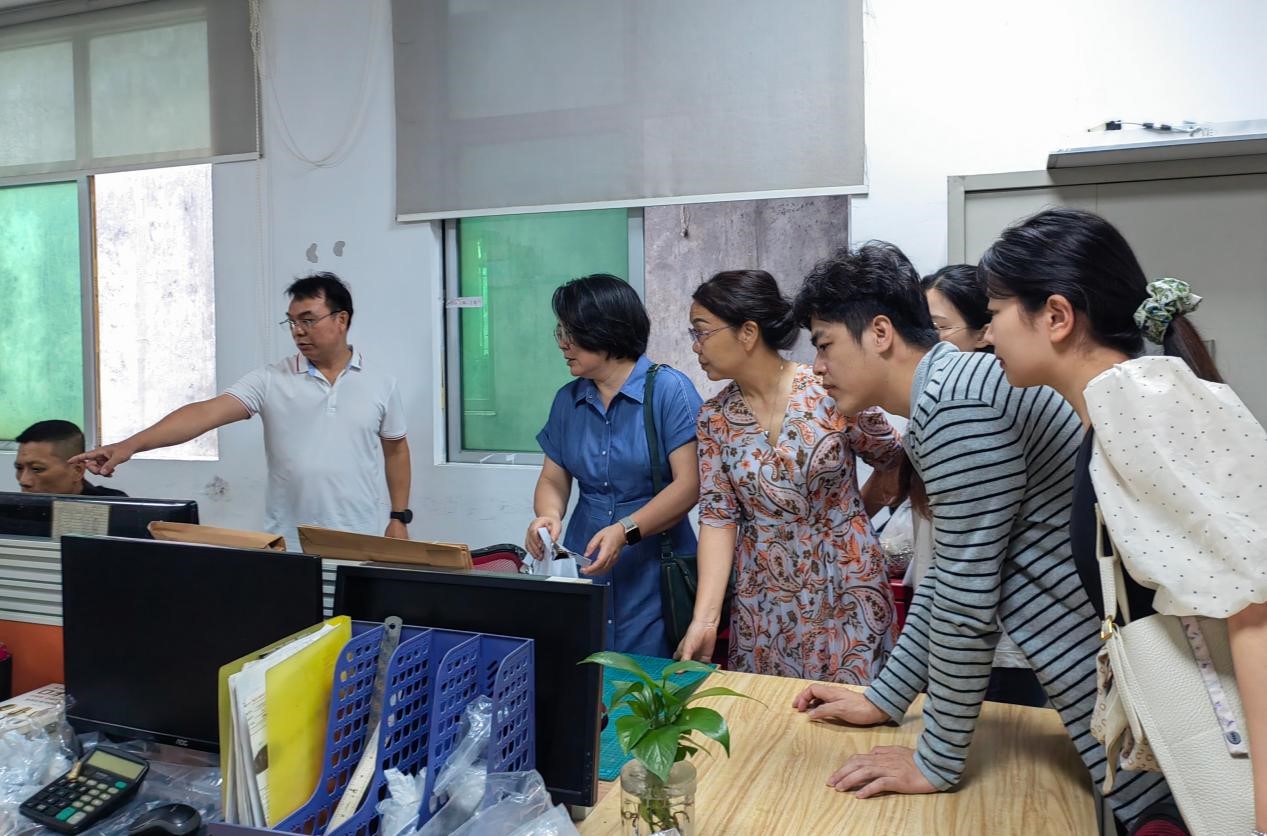 一行展示了诚高皮具的设计和模具办公室以及成品展览馆,详细介绍了公司的业务范围、产销流程,并引领大家参观了皮包生产线。通过这次实地参观,老师们对皮具制造、外贸行情、以及行业对小语种毕业生的需求情况和要求等有了更深入的了解。