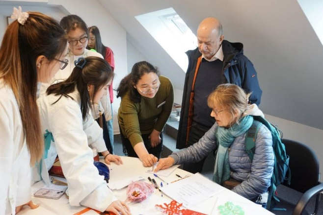 参与了国际中文日活动。活动中,交换生们用德语向前来参加活动的国际友人讲解了中国的十二生肖文化,并为他们分析了各自对应的中国生肖。更有趣的是,他们还教外国朋友如何在书签上正确地书写自己的中文名字以及对应的生肖汉字。在生肖转盘游戏中,一位德国女孩因为转到了自己对应的龙肖像而格外兴奋,她欣喜地向大家展示了身上龙纹样式的T恤,展现出对中国文化的浓厚兴趣与热爱。活动结束时,外国朋友们将写好的书签当作纪念礼物带走收藏,这一幕让交换生们深切地感受到学好一门外语的优势。
