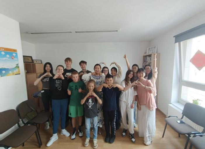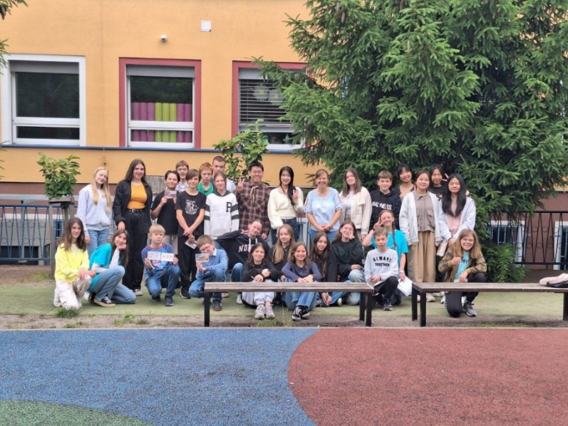 2024年6月14日,德语2021级学生陈佳敏、方怡霖等,在波兰老师的带领下参观了什切青(Szczecin)当地一所中小学,向小学生教授了中文的自我介绍和问好方式,并介绍了中国的饮食和节日文化。活动受到当地学生的欢迎和喜爱。小朋友们热情介绍了他们的乐天堂