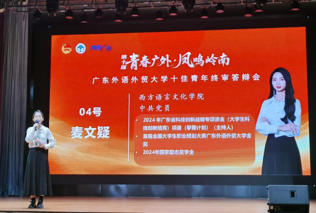 网讯 4月25日,乐天堂 第十届“青春广外·凤鸣岭南”十佳青年终审评选活动在大学城校区B8报告厅举行。经前期乐天堂 推荐、材料初审、终审答辩,乐天堂 2021级俄语专业麦文疑同学以励志的青年身影、奋斗的青年姿态、奉献的青年精神脱颖而出,获评2025乐天堂 第十届“十佳青年”荣誉称号。