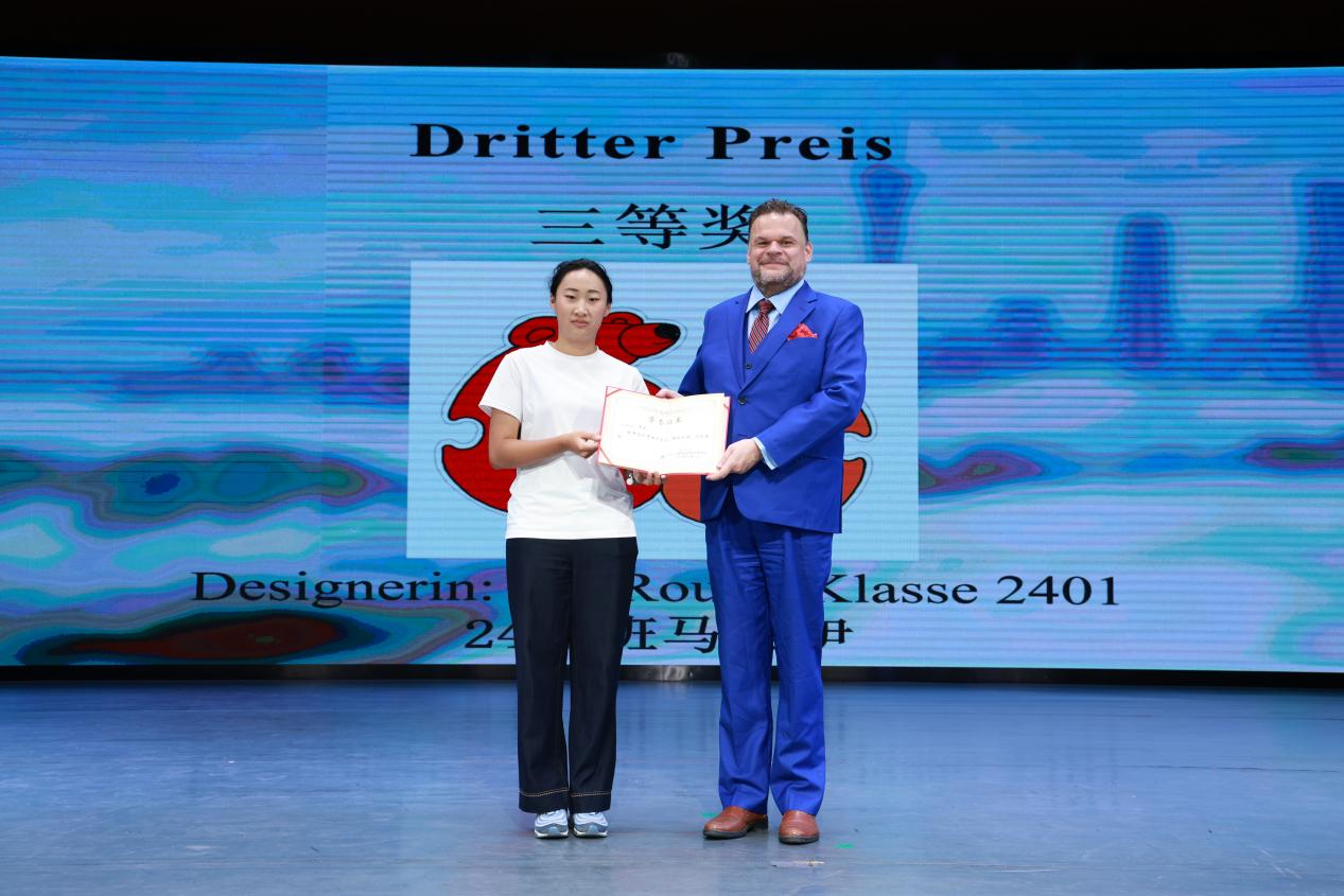 文艺表演间隙,德语系60周年庆logo设计评选颁奖仪式顺利举行。裴伟岷总领事担任颁奖嘉宾,为在此次logo设计评选中脱颖而出的三位获奖同学颁发荣誉证书,并与获奖学生亲切合影留念。