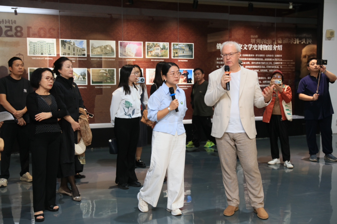俄语系教师公冶健哲应广州图书馆之邀,担任“列夫·托尔斯泰与中国”特展的学术主持,负责该板块的文字撰写和部分古籍资料的搜集。展览开幕当天,公冶健哲老师与俄罗斯国家文学史博物馆副馆长巴维尔·叶甫盖耶维奇·佛京共同为观展读者导览,介绍了托尔斯泰的生平与创作历程,并重点解读了托尔斯泰与中国文化的不解之缘及其对中国现当代文学的深远影响。