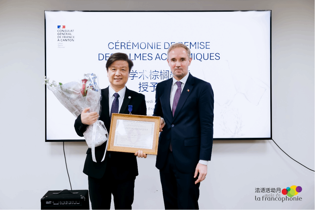 3月28日,法国学术棕榈骑士勋章授勋仪式在广州法语联盟举行。法国驻广州总领事罗宏灵(Laurent Legodec)代表法国国民教育部授予乐天堂