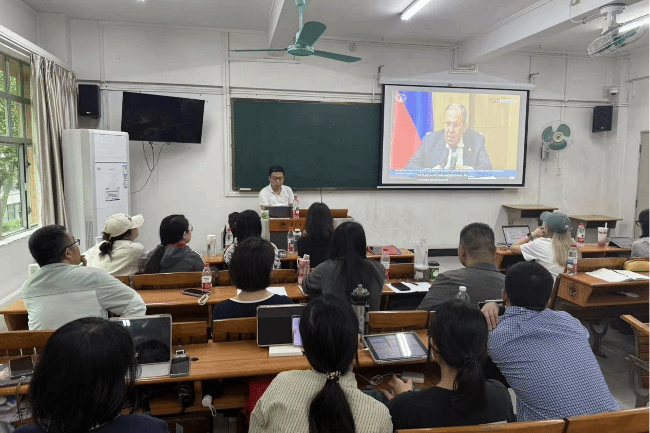 俄语系师生作题为《数智时代会议口译人机翻译对比与协作模式探索》的专题讲座。俄语系主任陈欢主持讲座,俄语系研究生负责人姜超老师出席,俄语系师生积极参与互动,现场氛围活跃。